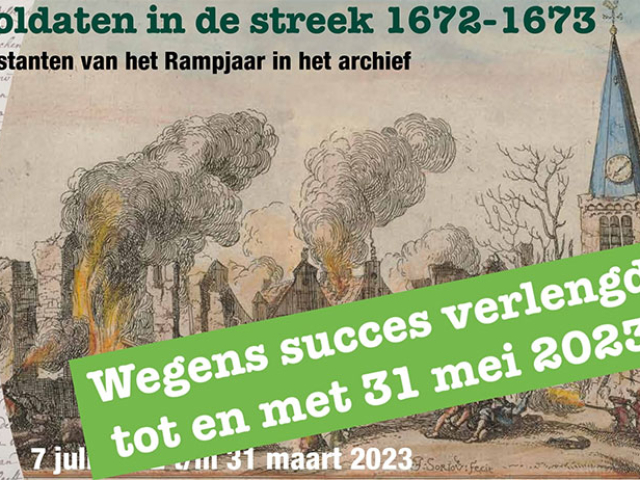 Ruim 2700 bezoekers hebben inmiddels onze tentoonstelling ‘Soldaten in de streek 1672-1673' bezocht. Om nog meer mensen de kans te geven de interactieve tentoonstelling te bekijken is deze verlengd tot en met 31 mei 2023, waarbij verschillende extra activiteiten worden georganiseerd. Op woensdag 19 april is er een lezing over het Rampjaar met aansluitend een rondleiding door de tentoonstelling. Op vrijdag 12 mei leer je tijdens een workshop paleografie oude handschriften en teksten ontcijferen. Voor middelbare scholen hebben wij een educatief programma over het Rampjaar en de tentoonstelling ontwikkeld. Het begeleidende boek bij de tentoonstelling ‘Soldaten in de Vechtstreek 1672-1673', waarin verhalen uit de tentoonstelling zijn gebundeld, is bij ons en (online)boekhandels verkrijgbaar.